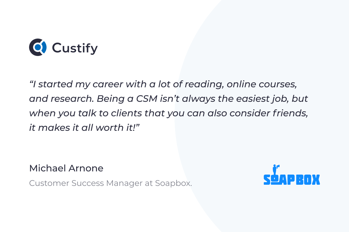“Customer Success was a way for me to advance my career where I could continue to make people smile and help them see all the benefits that Soapbox has to offer. I started my career with a lot of reading, online courses, and research. Being a CSM isn’t always the easiest job, but when you talk to clients that you can also consider friends, it makes it all worth it!”, says Michael Arnone, Customer Success Manager at Soapbox.